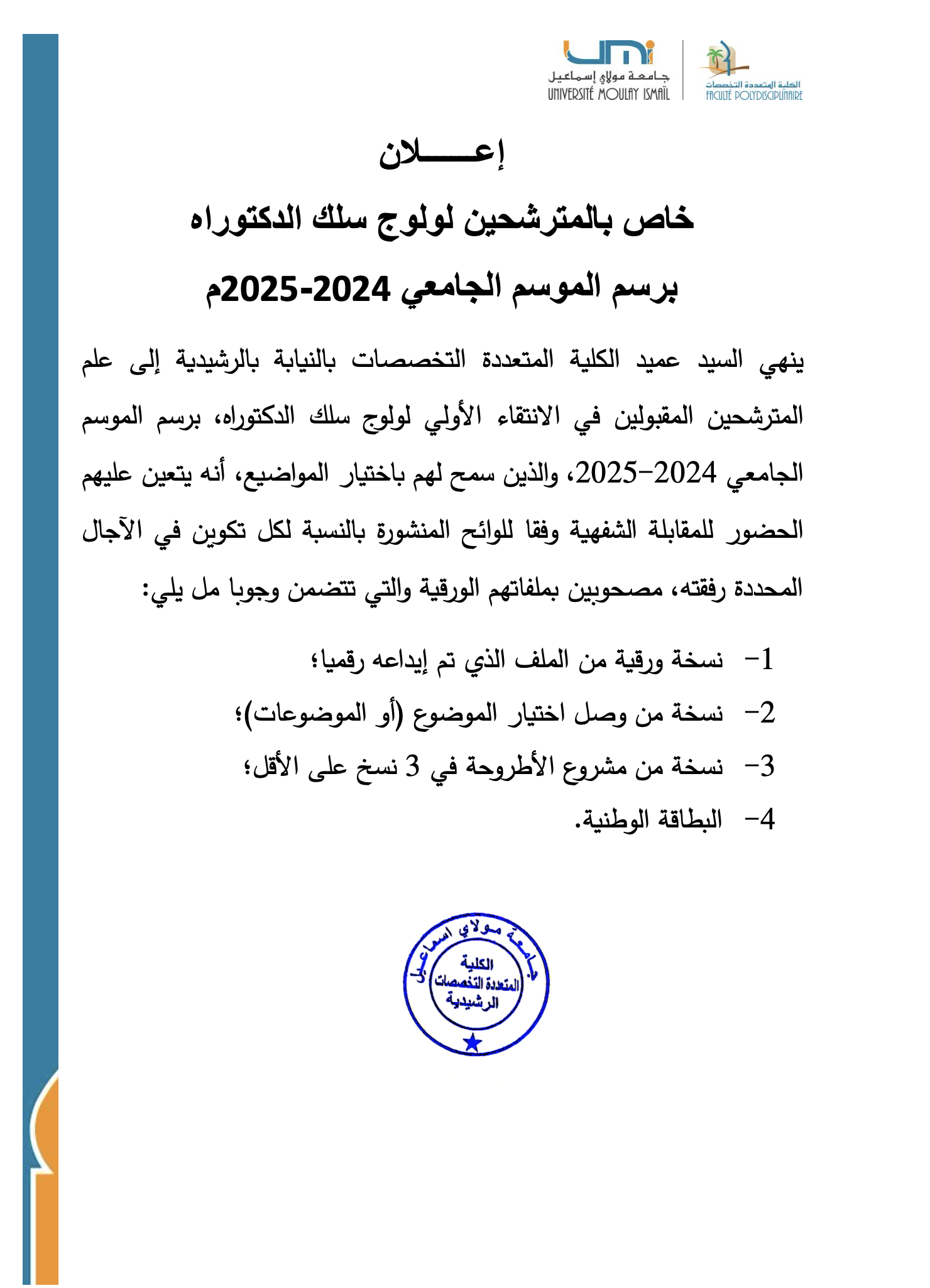 الإعلانات إعـــــــلان خاص بالمترشحين لولوج سلك الدكتوراه برسم الموسم الجامعي 2024-2025م تكوين الدكتوراه الخطاب والتكامل في اللغة والآداب والعلوم الإنسانية والشرعية تكوين الدكتوراه العلوم القانونية والسياسية أكمل القراءة