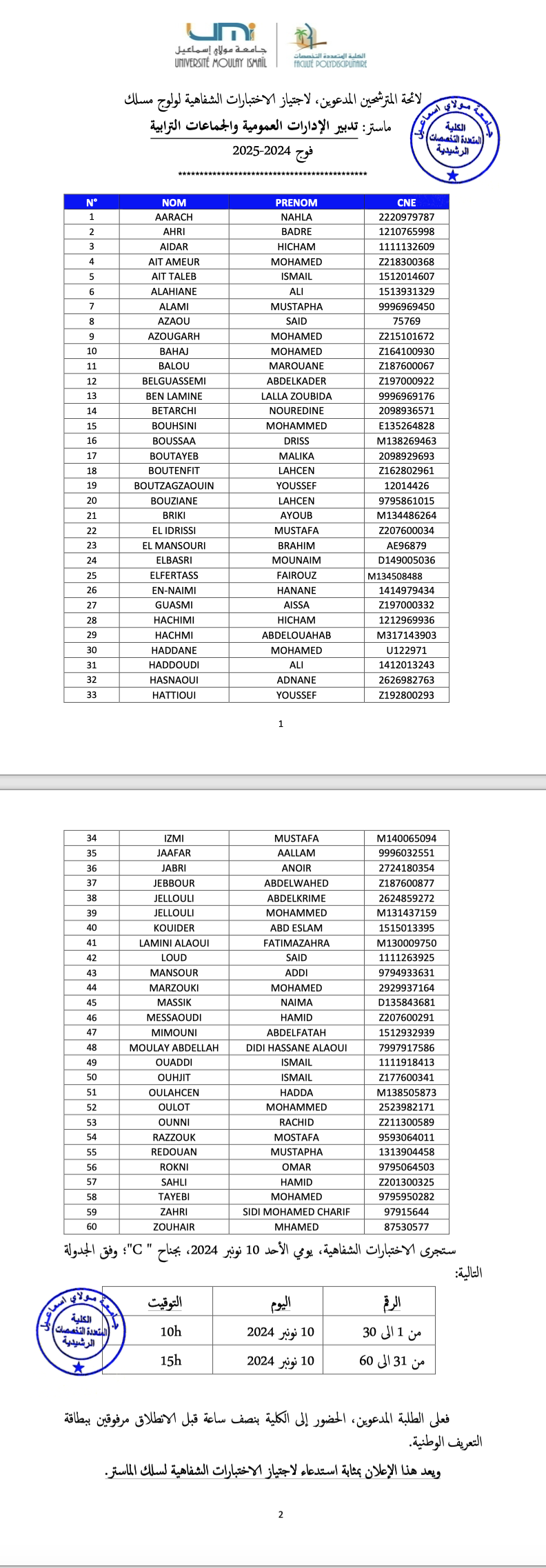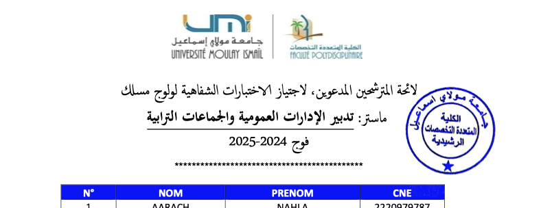لائحة المترشحين المدعوين، لاجتياز الاختبارات الشفاهية لولوج مسلك ماستر: تدبير الإدارات العمومية والجماعات الترابية فوج 2024-2025