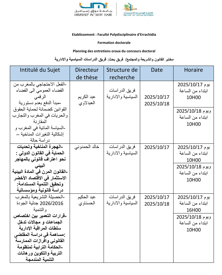 يخبر الأساتذة: عبد اللطيف المتدين والمحجوب الدربالي وحسن بداوي، المنتسبون إلى فريق البحث في الدراسات القانونية والاجتماعية والسياسية الطلبة المرشحين للولوج إلى سلك الدكتوراه أن المقابلة الشفوية ستُعقد يوم السبت 18 أكتوبر 2025 الساعة التاسعة والنصف صباحا بالجناح –C– بالكلية المتعددة التخصصات بالرشيدية.