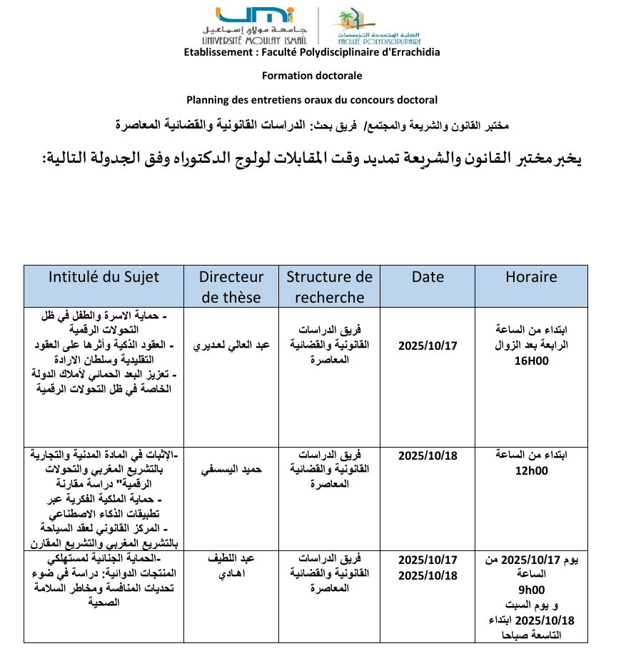 يخبر الأساتذة: عبد اللطيف المتدين والمحجوب الدربالي وحسن بداوي، المنتسبون إلى فريق البحث في الدراسات القانونية والاجتماعية والسياسية الطلبة المرشحين للولوج إلى سلك الدكتوراه أن المقابلة الشفوية ستُعقد يوم السبت 18 أكتوبر 2025 الساعة التاسعة والنصف صباحا بالجناح –C– بالكلية المتعددة التخصصات بالرشيدية.